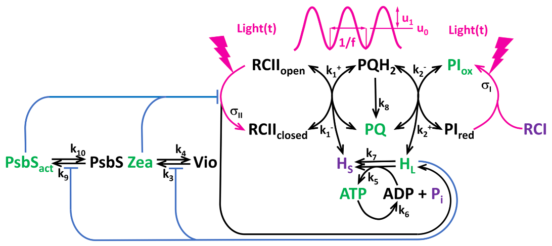 We saw about the fluorescence response of plants to oscillating light stimulation in a previous post. I want here to present a model for these responses based on a system of…