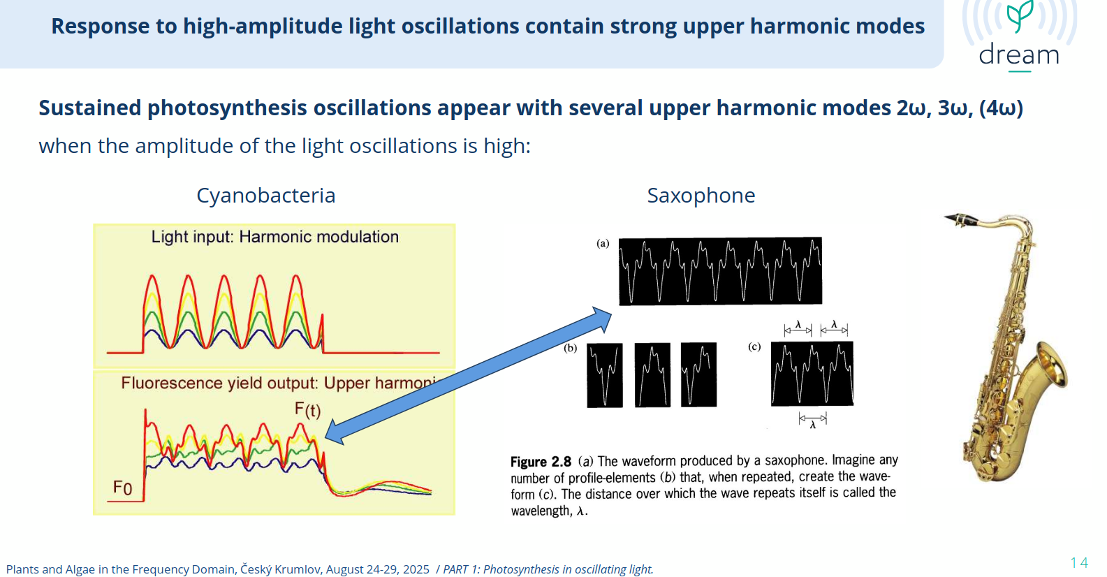 It is possible to study such non-linear systems by sinewave stimulation and tracking harmonics in the response spectrum, higher harmonics being indicative of non-linearities in the system. Ladislav Nedbal in his talk at the DREAM workshop 2025 suggested, from visual inspection, that the waveform of the fluorescence he measured in response to oscillating light is similar to that of a saxophone.